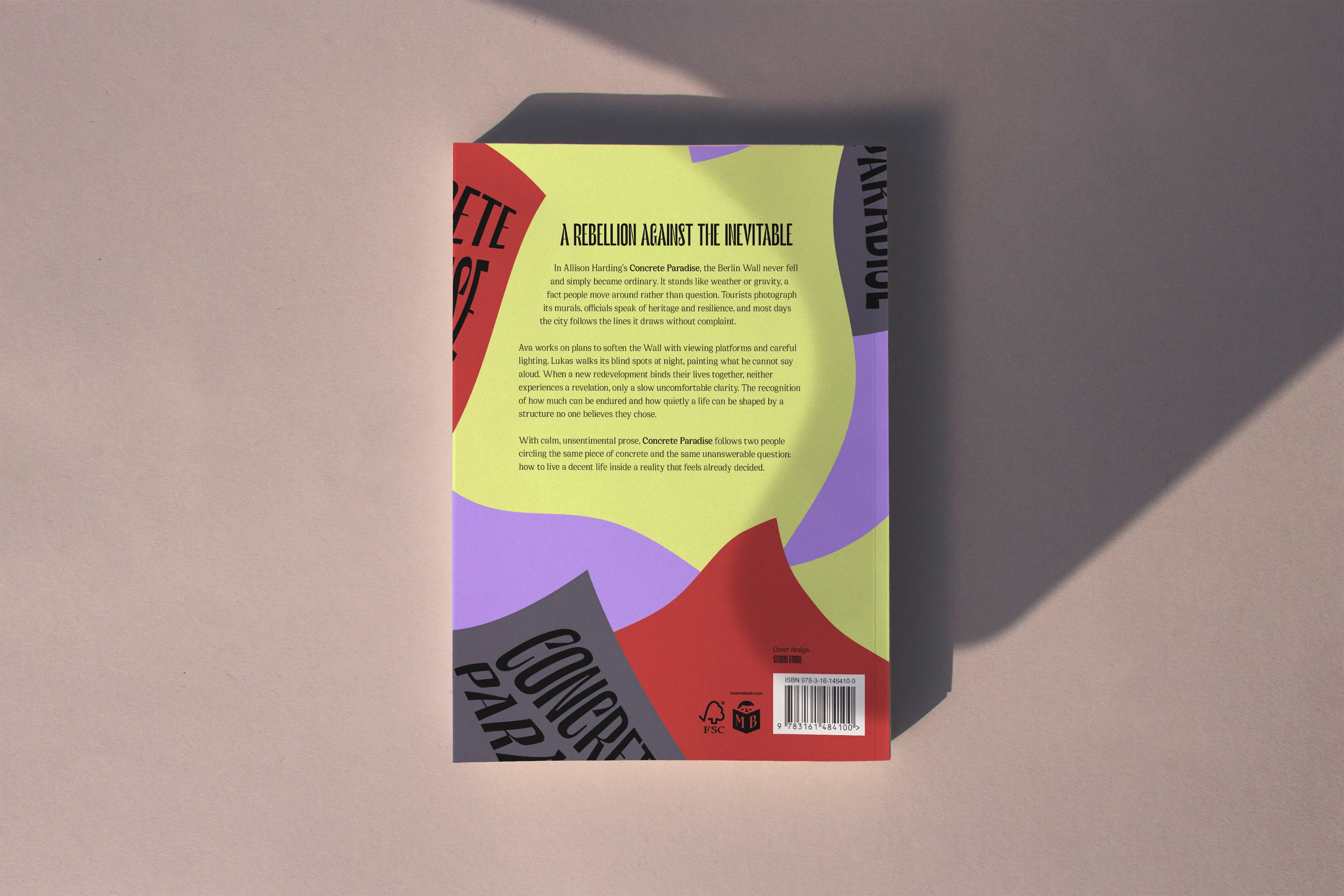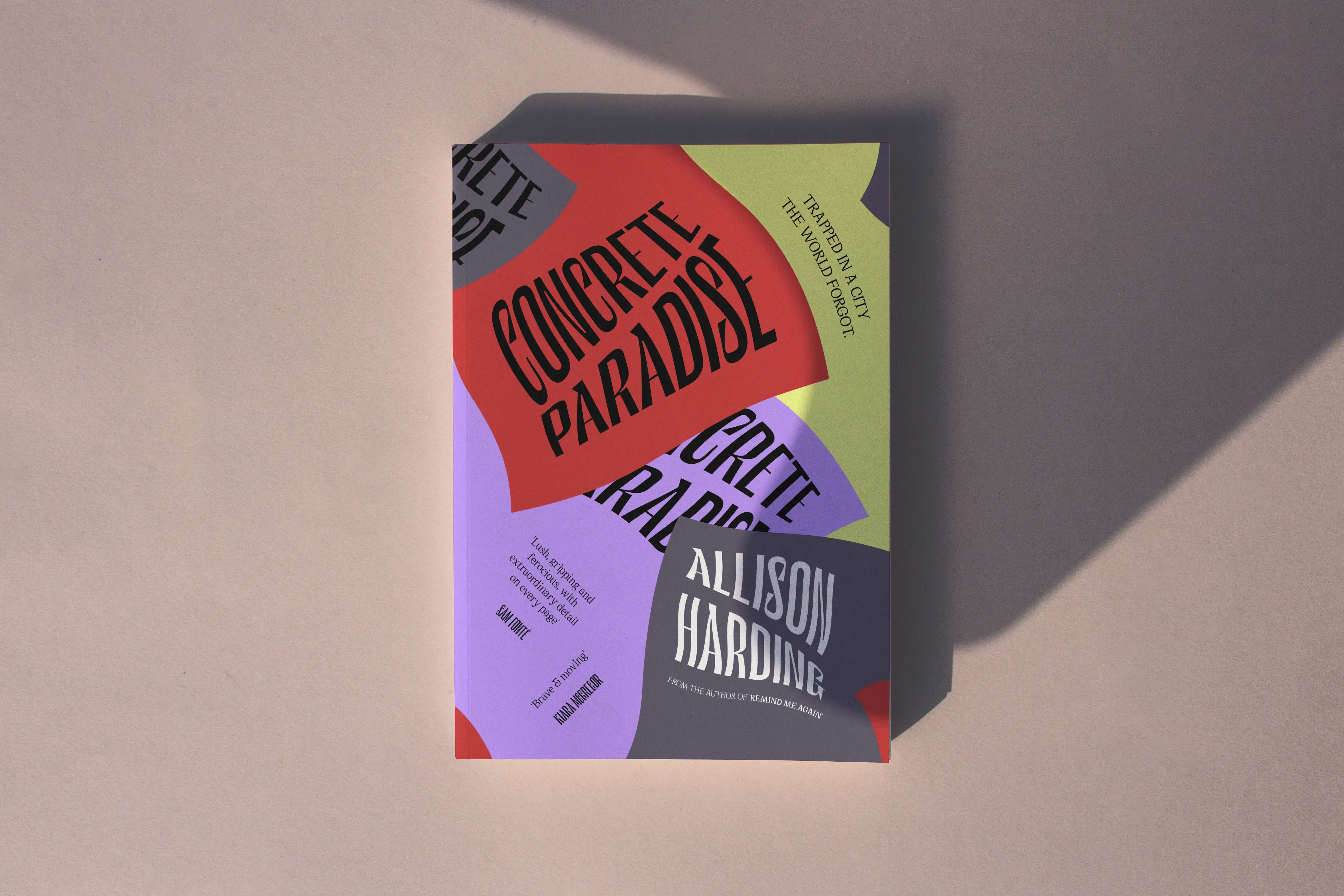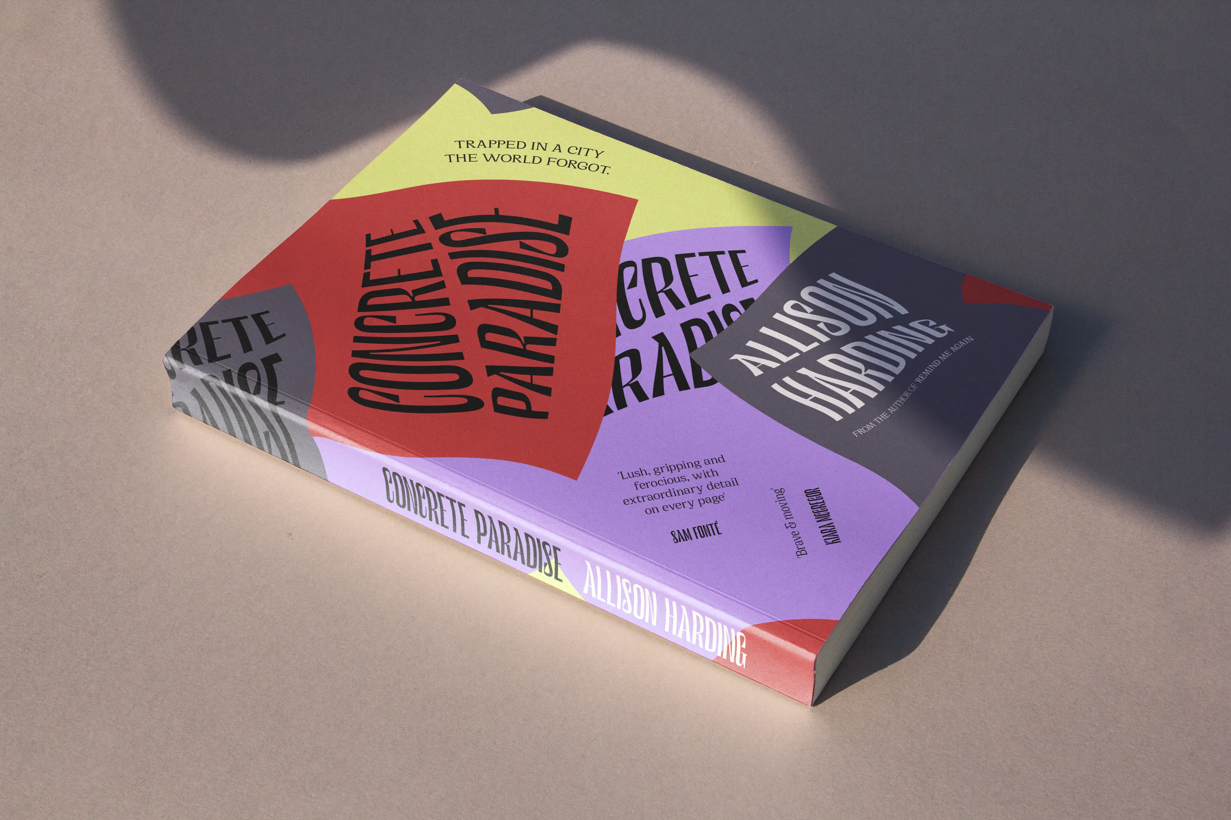 The cover for Concrete Paradise uses movement to capture tension. Skewed blocks of colour carry the title and author like wind-whipped flags or protest signs mid-march. It’s graphic, immediate and quietly defiant. Written by Allison Harding, the novel imagines a present where the Berlin Wall still stands and a city remains split by silence and surveillance. At its heart are two young artists smuggling forbidden images across the divide. A gripping story of defiance and the fierce pull of freedom in a fractured world.