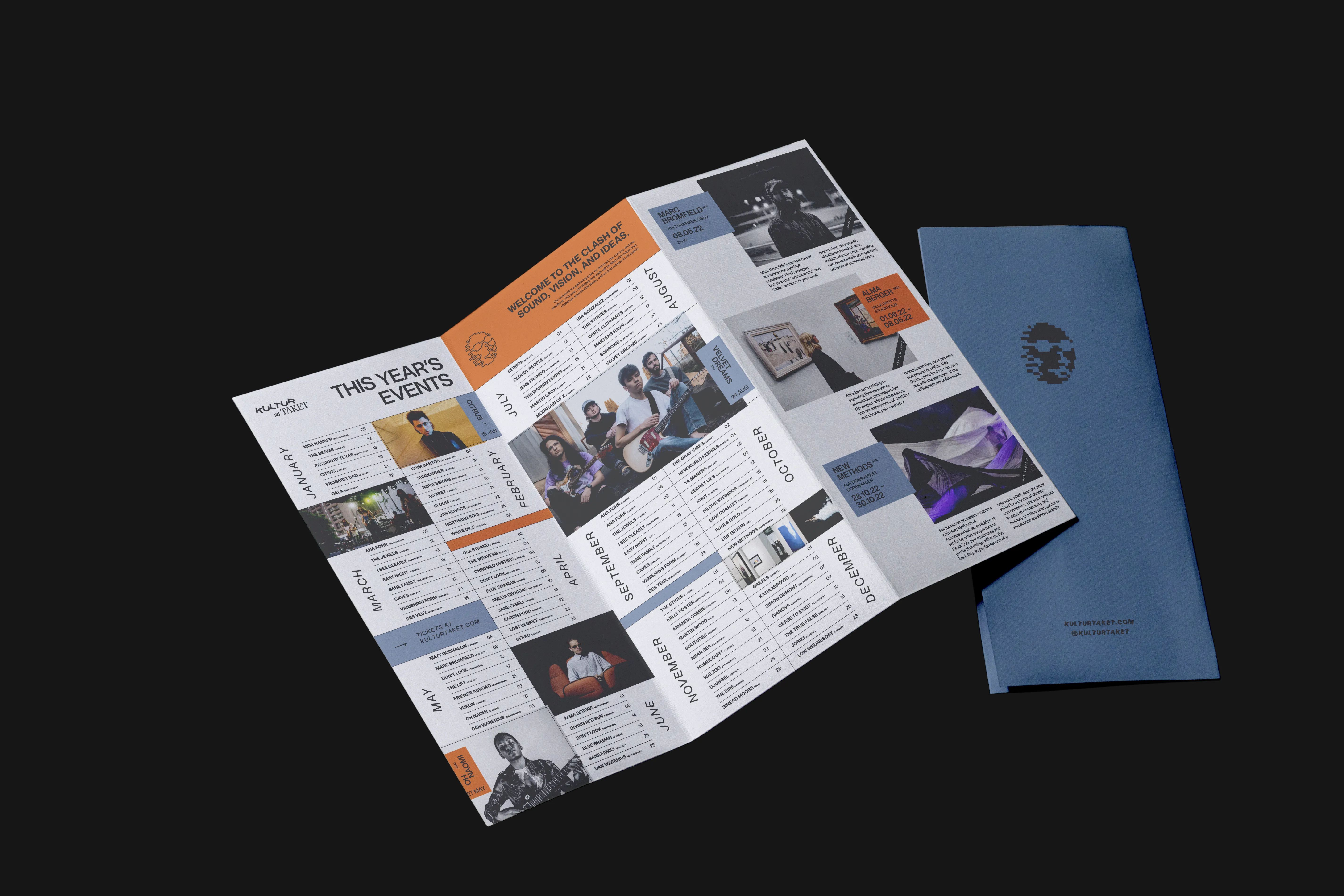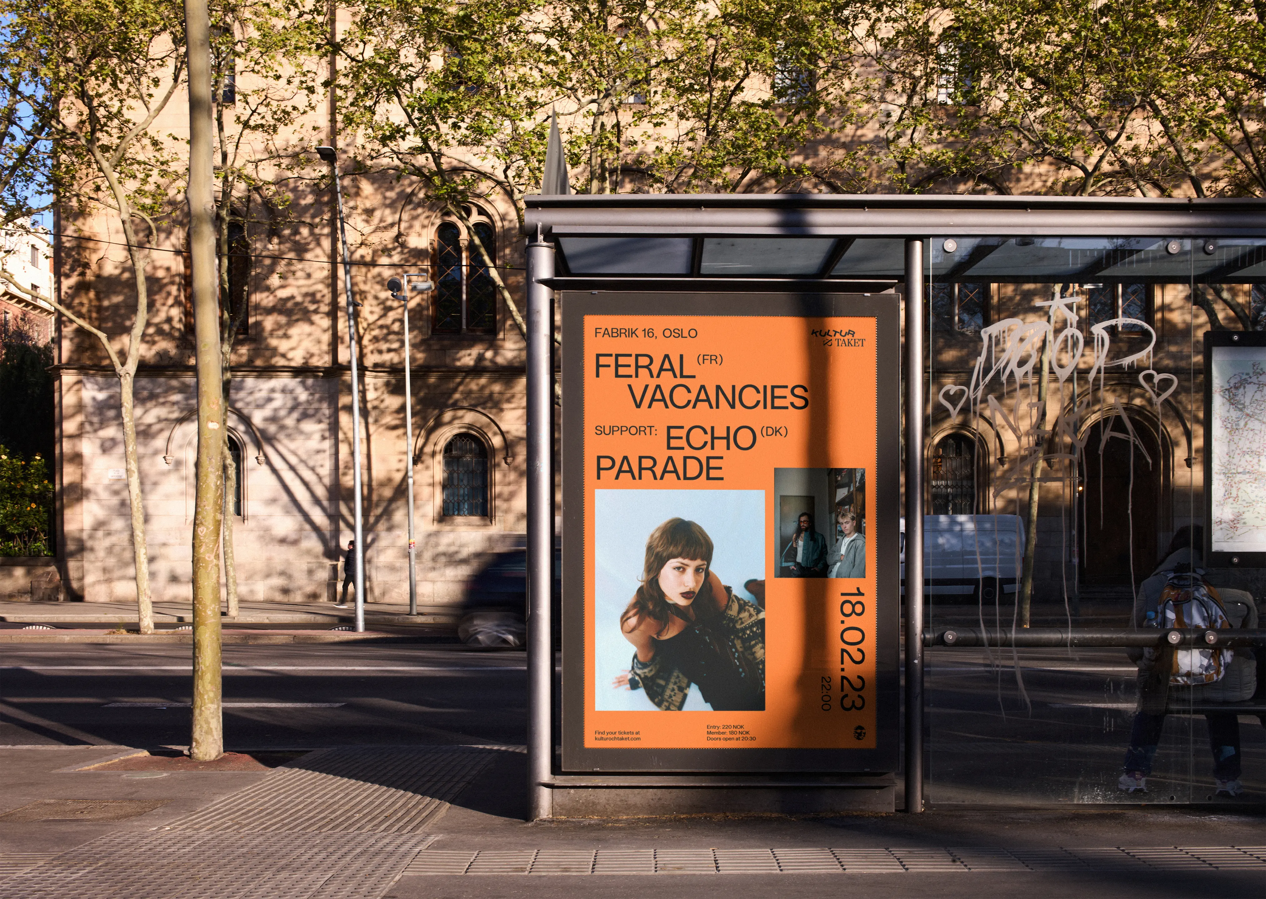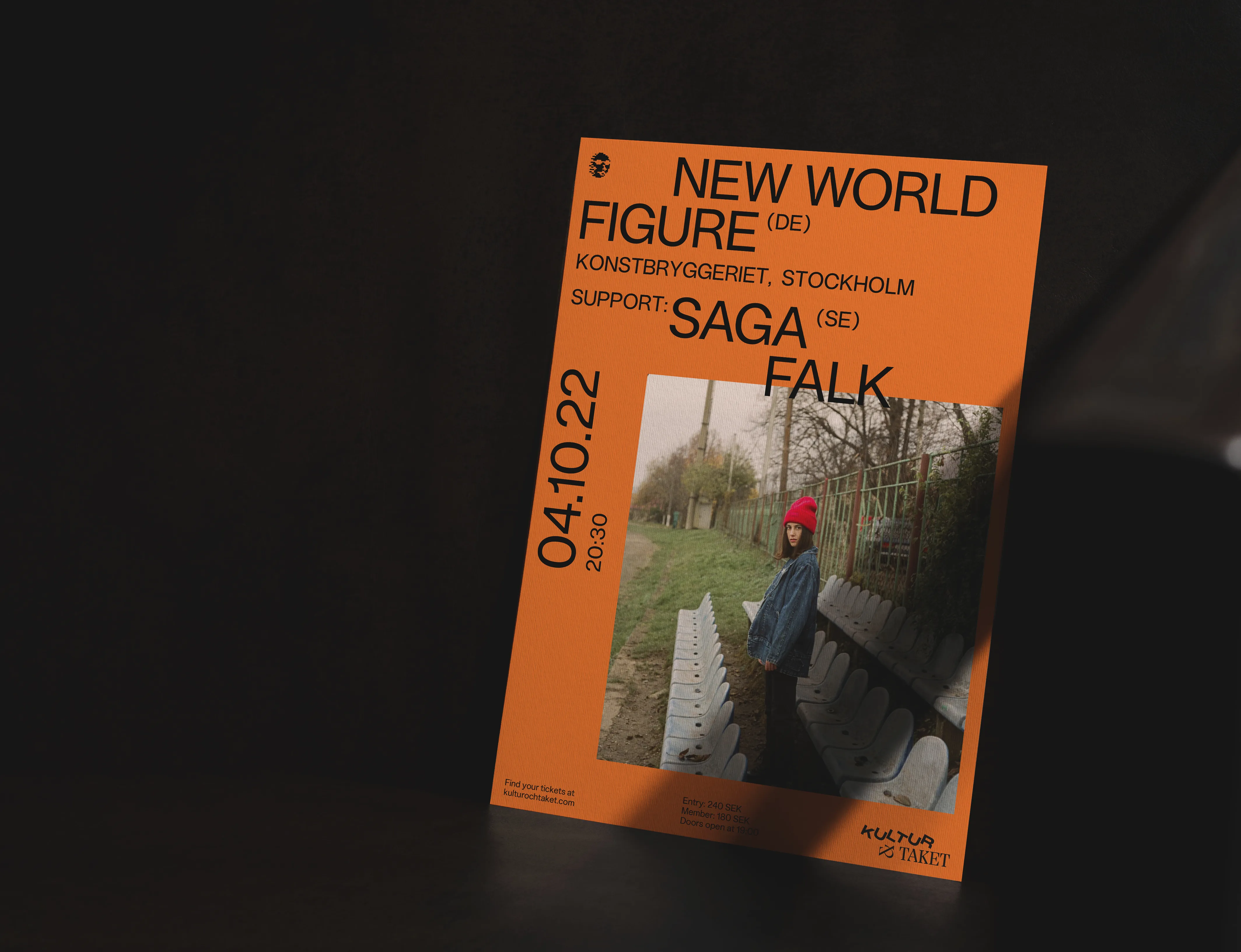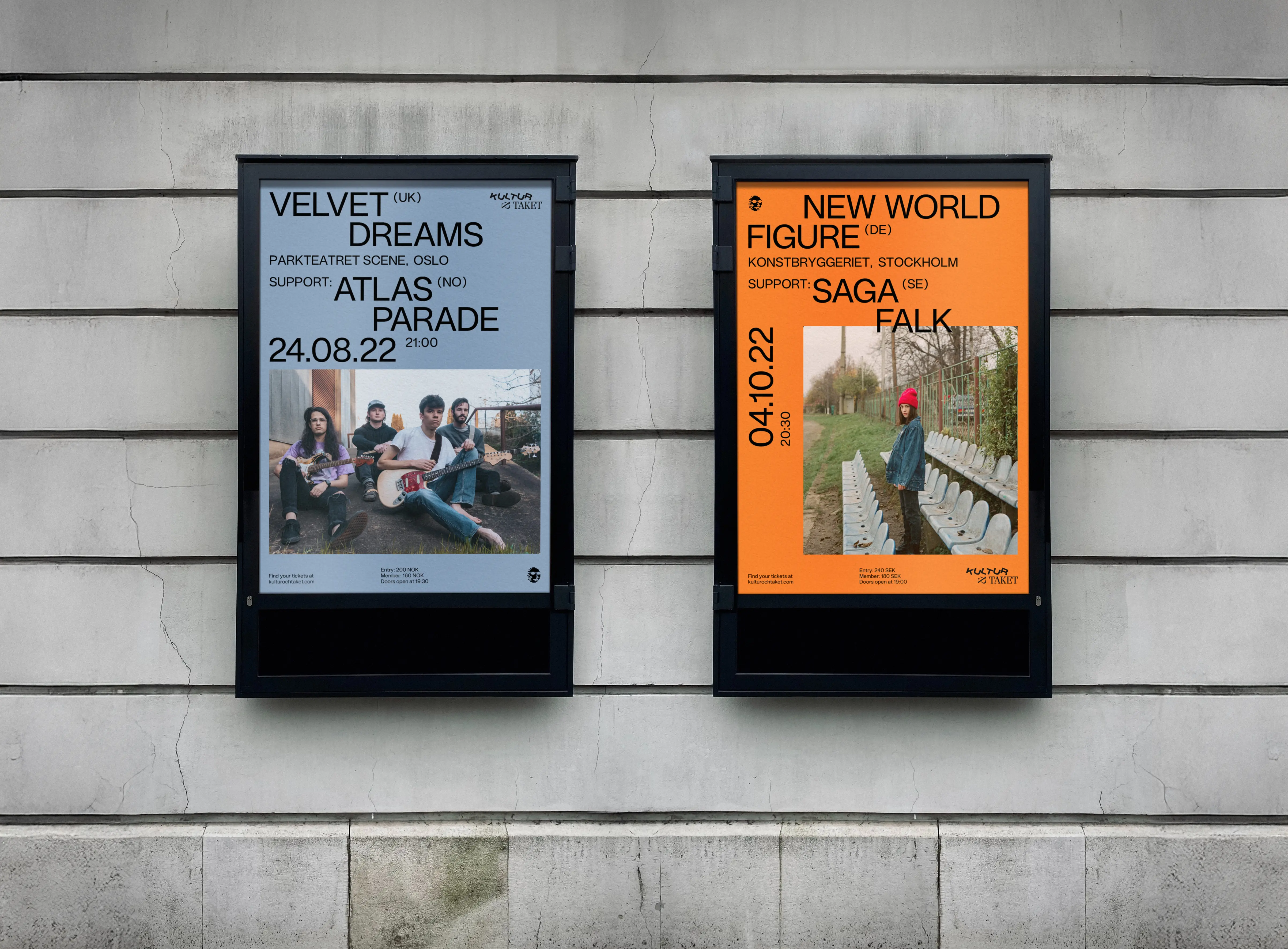 Kultur & Taket is a Scandinavian cultural hub where underground concerts, provocative talks and boundary-pushing exhibitions find a home across the Nordics. The brand marries minimalist Nordic calm with raw industrial grit. The identity consists of clean geometric layouts, distinct grids, punctuated by bursts of orange and pale steel-blue accents. Typography is stripped-back yet bold, while graphic elements evoke warehouse walls and concert stages. It’s a visual language that promotes emerging artists and new bands, reflecting both the serene roots of Scandinavian design and the youthful charge of live culture.