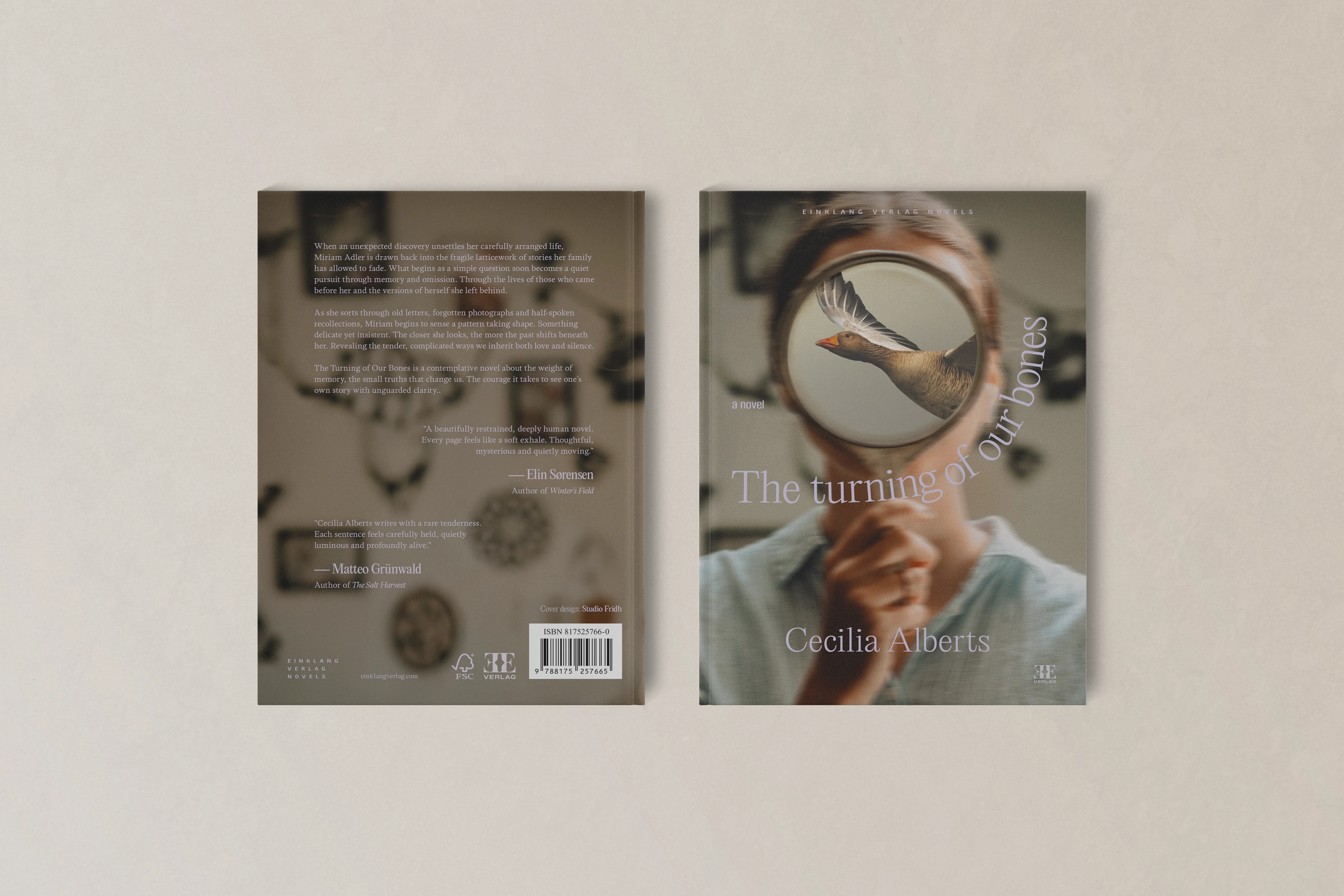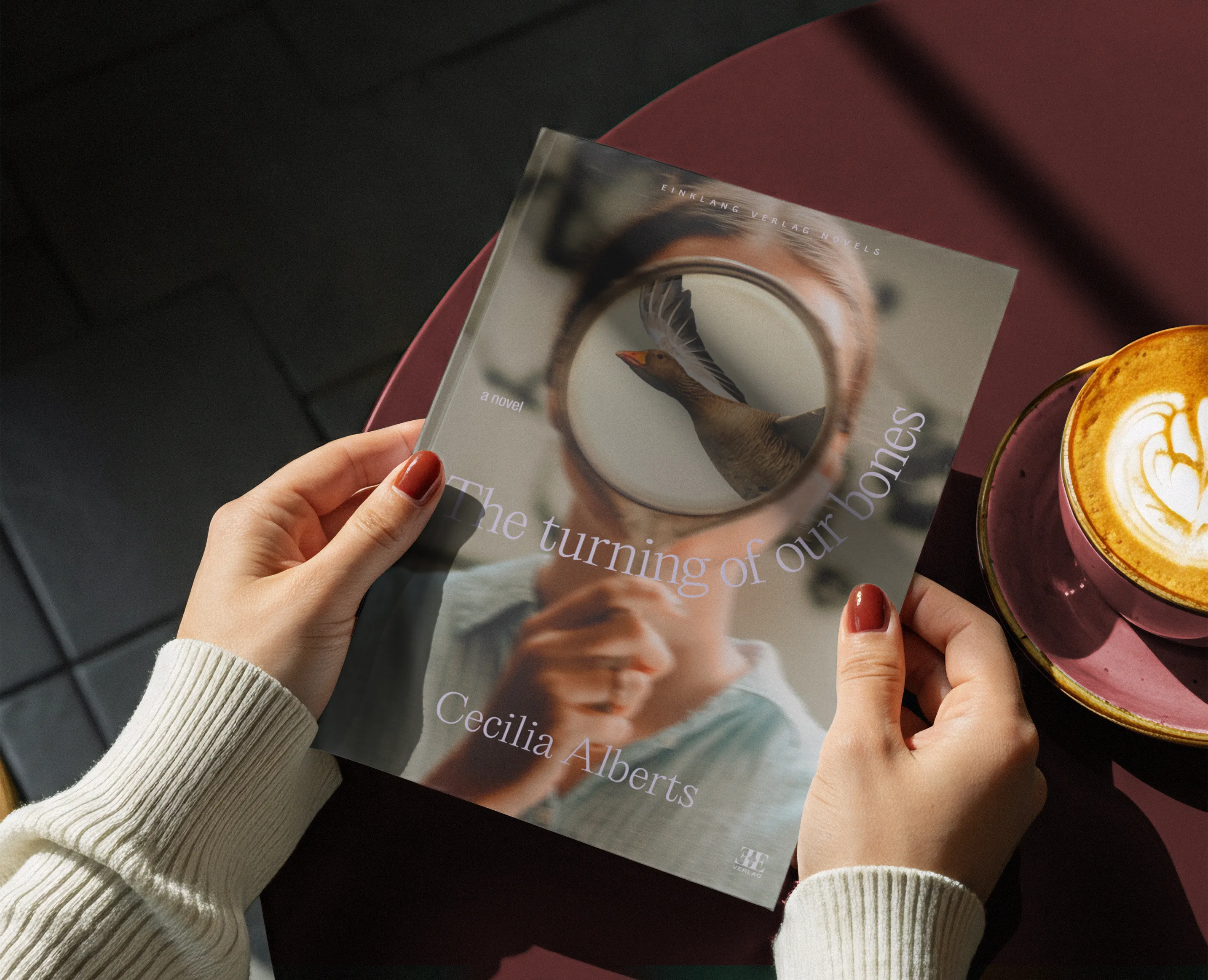 The Turning of Our Bones called for a visual atmosphere that felt intimate, uncanny and quietly symbolic. The story follows a woman who begins to trace the fading histories of her family after an unexpected discovery unsettles the life she thought she knew. To mirror this gentle unravelling, the cover frames a blurred figure behind a magnifying glass, revealing a single bird frozen mid-flight. An image that suggests migration and the fragile truths at the heart of the story.